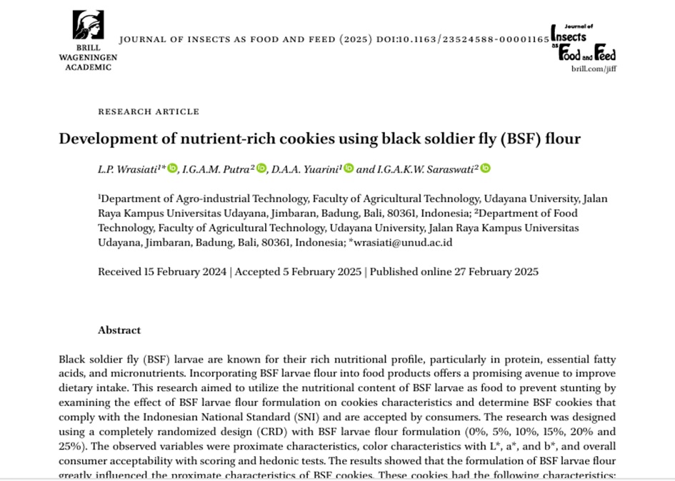 Deskripsi : Black soldier fly (BSF) larvae are known for their rich nutritional profile, particularly in protein, essential fatty acids, and micronutrients. Incorporating BSF larvae flour into food products offers a promising avenue to improve dietary intake.