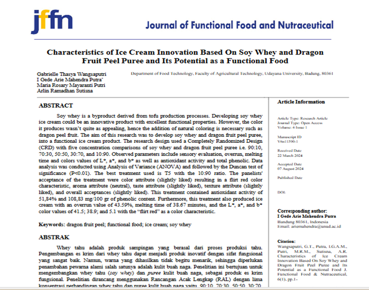 Deskripsi: Soy whey is a byproduct derived from tofu production processes. The development of soy whey ice cream could be an innovative product with excellent functional properties. However, the color it produces wasn’t quite as appealing, hence the addition of natural coloring is necessary such as dragon peel fruit.