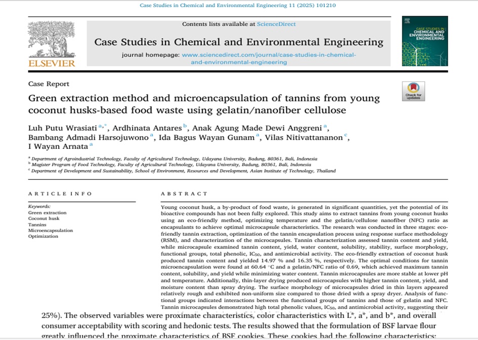 Deskripsi : Young coconut husk, a by-product of food waste, is generated in significant quantities, yet the potential of its bioactive compounds has not been fully explored. This study aims to extract tannins from young coconut husks using an eco-friendly method, optimizing temperature and the gelatin/cellulose nanofiber (NFC) ratio as encapsulants to achieve optimal microcapsule characteristics.