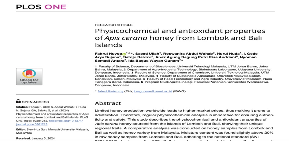 Deskripsi : Limited honey production worldwide leads to higher market prices, thus making it prone to adulteration. Therefore, regular physicochemical analysis is imperative for ensuring authenticity and safety. This study describes the physicochemical and antioxidant properties of Apis cerana honey sourced from the islands of Lombok and Bali, showing their unique regional traits.