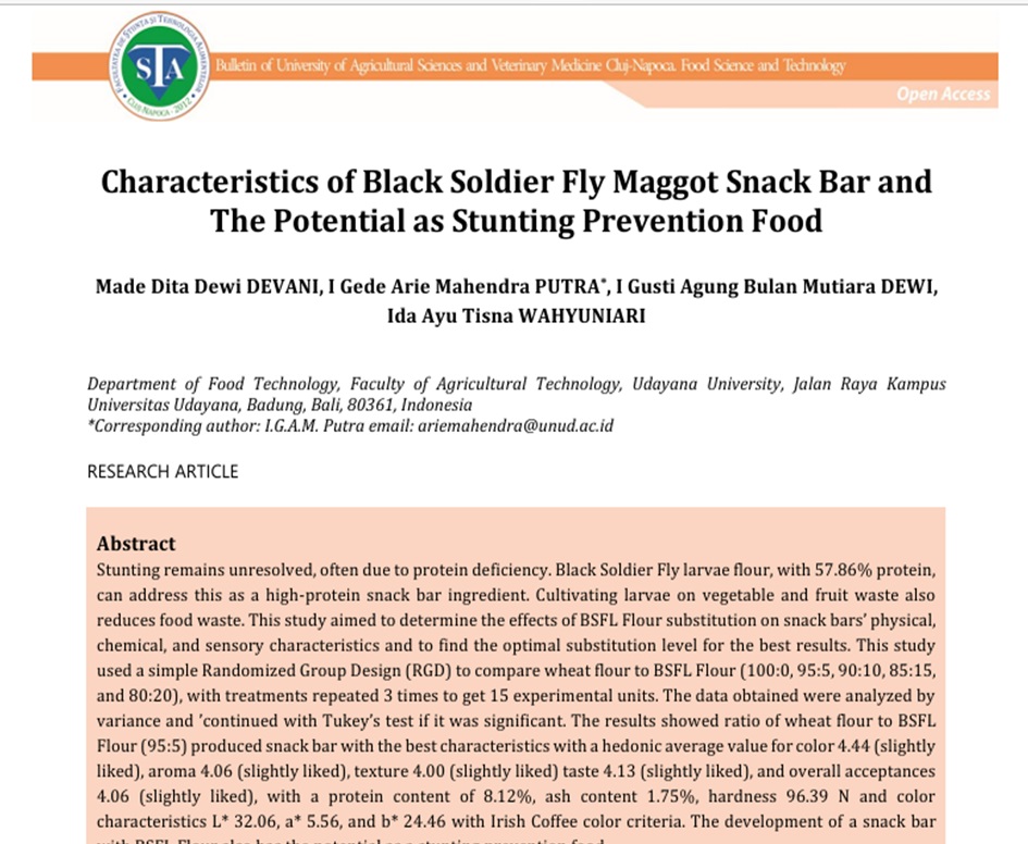 Deskripsi : Stunting remains unresolved, often due to protein deficiency. Black Soldier Fly larvae flour, with 57.86% protein, can address this as a high-protein snack bar ingredient. Cultivating larvae on vegetable and fruit waste also reduces food waste. This study aimed to determine the effects of BSFL Flour substitution on snack bars’ physical, chemical, and sensory characteristics and to find the optimal substitution level for the best results.