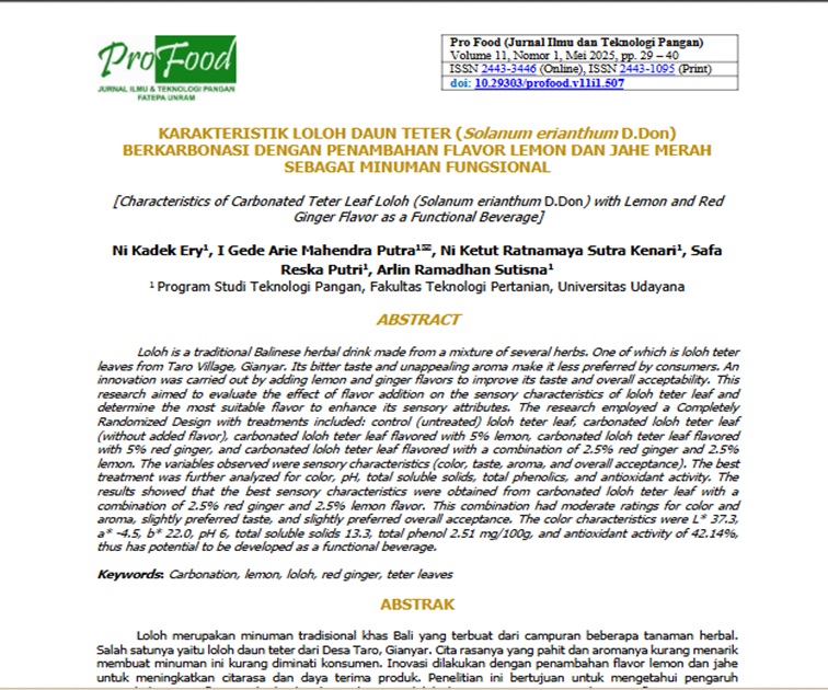 Deskripsi : Loloh merupakan minuman tradisional khas Bali yang terbuat dari campuran beberapa tanamanherbal. Salah satunya yaitu loloh daun teter dari Desa Taro, Gianyar. Cita rasanya yang pahit dan aromanya kurang menarik membuat minuman ini kurang diminati konsumen.