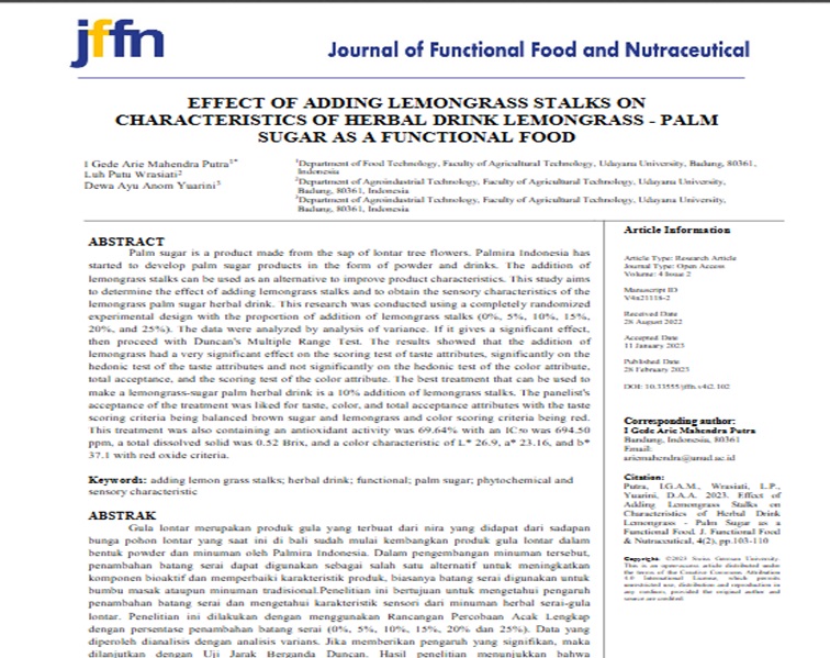 Effect of Adding Lemongrass Stalks on Characteristics of Herbal Drink Lemongrass – Palm Sugar as a Functional Food