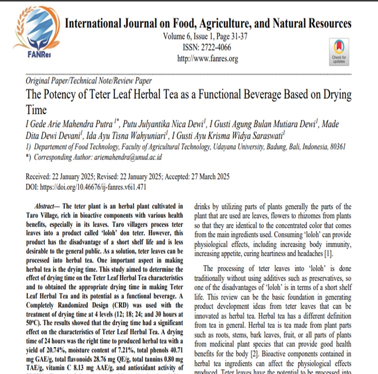 Deskripsi : The teter plant is an herbal plant cultivated in Taro Village, rich in bioactive components with various health benefits, especially in its leaves. Taro villagers process teter leaves into a product called ‘loloh’ don teter. However, this product has the disadvantage of a short shelf life and is less desirable to the general public.