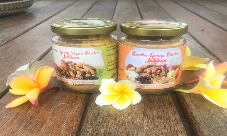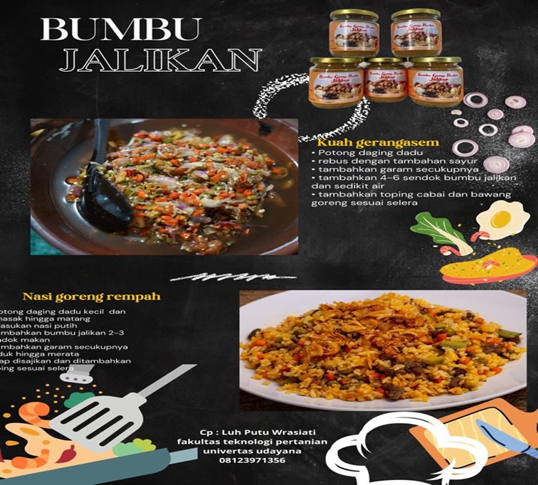 Deskripsi Produk: Bumbu genep yang merupakan racikan bumbu khas Bali diolah menjadi bentuk bubuk (powder) untuk meningkatkan nilai tambah, daya saing, dan umur simpan produk, sehingga lebih praktis digunakan dan berpotensi menembus pasar yang lebih luas. Proses hilirisasi dilakukan secara menyeluruh, mulai dari identifikasi permasalahan di lapangan, standarisasi proses produksi, peningkatan pemahaman tentang bahan baku, hingga implementasi prinsip hygiene dan sanitasi dalam pengolahan pangan. Produk ini telah memperoleh izin edar P-IRT, sebagai langkah awal menuju pasar komersial yang lebih luas. Pendampingan ini merupakan wujud nyata sinergi antara dunia akademik dan industri dalam mendorong kemandirian dan inovasi pangan lokal.
