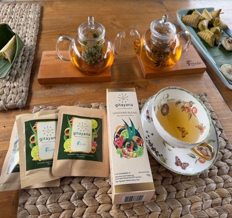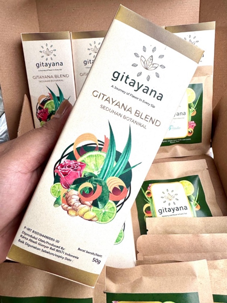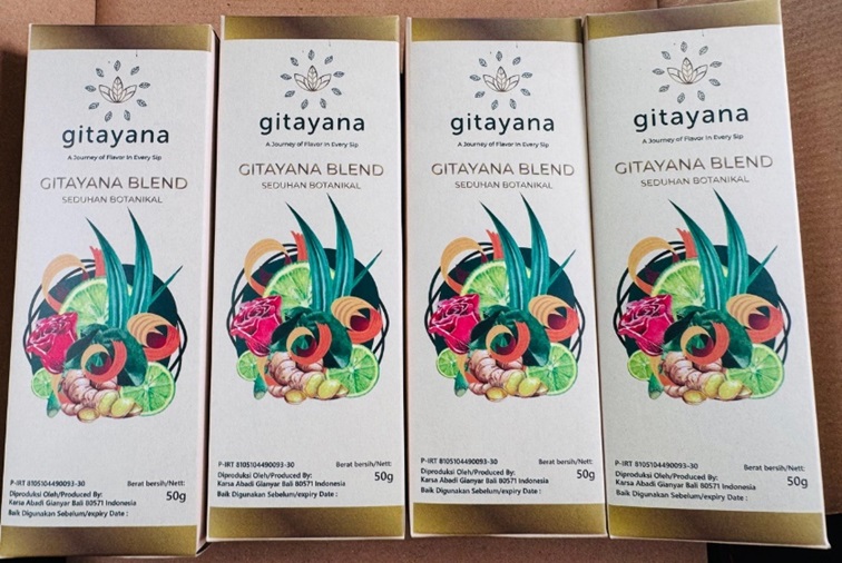 Deskripsi Produk: Gitayana Blend (seduhan botanical) produk teh herbal perpaduan yang menyenangkan dari aroma serai, kayu secang, kehangata jahe dan kesegaran jeruk nipis yang disempurnakan dengan sentuhan daun jeruk purut, pandan serta kelembutan dari kelopak mawar. Racikan ini menawarkan perjalanan rasa bagi konsumen yang ingin menikmati kelezatan dari bahan-bahan alam. Produk yang berkolaborasi dengan PT. Karsa Abadi Bali (Made Tea) Ubud telah berhasil lolos sertifikat Halal dan Ijin edar BPOM dengan nomor BPOM RI MD 272282001600095.
