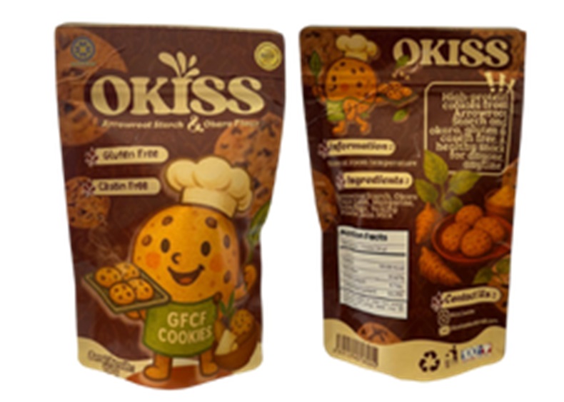 Deskripsi Produk: OKISS: Inovasi Kukis Gluten Free-Casein Free Berbahan Dasar Tepung Garut dan Tepung Okara sebagai Pangan Fungsional hadir dalam menjawab Ketergantungan Indonesia terhadap gandum impor sebagai bahan baku utama tepung dalam industri roti yang menghadirkan tantangan terhadap ketahanan pangan nasional. Diversifikasi sumber pangan dengan memanfaatkan sumber daya lokal merupakan solusi strategis untuk mengurangi ketergantungan tersebut. Tepung garut (Maranta arundinacea L.), yang dikenal memiliki kandungan karbohidrat tinggi dan indeks glikemik rendah, menjadi alternatif pengganti tepung terigu yang menjanjikan dalam pembuatan kue kering (cookies). Namun, kandungan protein dan seratnya yang rendah memerlukan penambahan bahan bergizi seperti okara, limbah hasil olahan kedelai yang kaya protein dan serat pangan.
