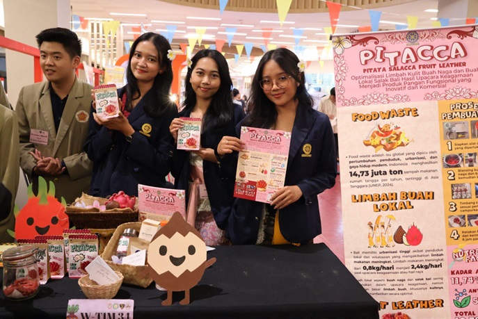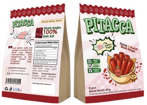 Deskripsi Produk: Pitacca (Pitaya and Salacca Fruit Leather) merupakan produk inovasi pangan fungsional yang memanfaatkan limbah yang dihasilkan pada upacara keagamaan masyarakat Hindu Bali yaitu buah salak dan buah naga. Produk ini memiliki tujuan untuk memaksimalkan pemanfaatan limbah organik, khususnya dari upacara keagamaan dan konsumsi rumah tangga. Pitacca kaya akan senyawa bioaktif seperti antioksidan (50,07%), vitamin C (4,02 mg AAE/g), fenol (10,78 mg GAE/g fenol), yang berperan penting dalam menangkal radikal bebas. Pitacca memiliki karakteristik warna merah cranberry, tekstur plastis, dan rasa manis alami dengan total gula 50,39%, Pitacca tidak hanya mendukung pengurangan limbah pangan tetapi juga memenuhi standar mutu pangan manisan kering. Produk ini memiliki nilai komersial yang tinggi dan berkontribusi pada sistem pangan yang lebih berkelanjutan serta ramah lingkungan.