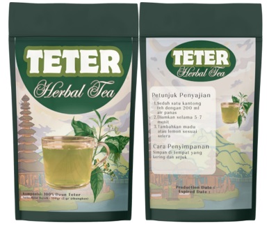 Deskripsi Produk: Inovasi daun teter menjadi teh herbal daun teter muncul dikarenakan permasalahan yang didapatkan oleh Masyarakat Desa taro khususnya KWT Dwi Tunggal Putri yang mengolah daun teter menjadi produk yang disebut loloh don teter. Namun, produk ini memiliki kelemahan yaitu masa simpan yang pendek dan kurang diminati oleh masyarakat umum. Sebagai solusi, daun teter dapat di inovasikan menjadi teh herbal. Hasil penelitian menunjukkan bahwa waktu pengeringan selama 24 jam merupakan waktu yang tepat untuk menghasilkan teh herbal dengan rendemen sebesar 20,74%, kadar air 7,21%, total fenol 40,71 mg GAE/g, total flavonoid 28,76 mg QE/g, total tanin 0,80 mg TAE/g, vitamin C 8,13 mg AAE/g, dan aktivitas antioksidan sebesar 85,55%. Daun teter memiliki potensi untuk dikembangkan sebagai minuman fungsional.