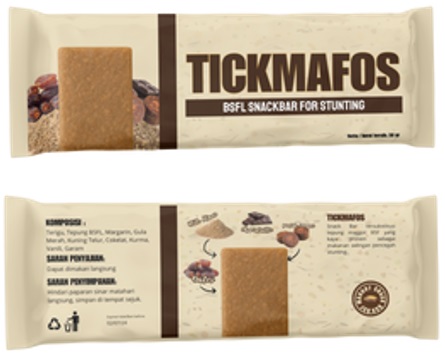 Deskripsi Produk: Produk makanan selingan (Snack Bar) yang diproduksi dengan mensubstitusi terigu menggunakan tepung maggot BSF (Black Soldier Fly) dan pemanfaatan gula kelapa lokal sebagai pengganti gula pasir. Produk ini dibuat dengan tujuan memenuhi asupan protein harian yang berpotensi sebagai upaya pencegahan stunting. Karakteristik snack bar terbaik diperoleh pada perlakuan tepung terigu:tepung maggot dengan perbandingan 95:5, yang menghasilkan karakteristik sebagai berikut: kadar protein sebesar 8,12%, kadar abu sebesar 1,75%, serta karakteristik sensori berdasarkan uji hedonik, yaitu warna 4,44 (sedikit disukai), aroma 4,06 (sedikit disukai), tekstur 4,00 (sedikit disukai), rasa 4,13 (sedikit disukai), dan penerimaan keseluruhan 4,06 dengan kriteria sedikit disukai. Karakteristik warna berdasarkan nilai L* 32,06, a* 5,56, dan b* 24,46 dengan kriteria warna Irish coffee.